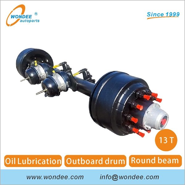 This axle suits skeletal trailers, lowbed trailers, flatbed trailers, dump trailers, car transport trailers, oil tank trailers, van trailers, full trailers, logging transport trailers, and agricultural vehicles.