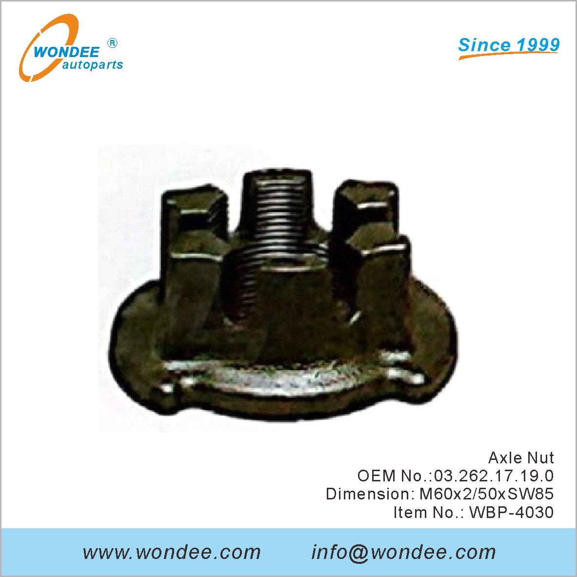 Axle NutOEM No.:03.262.17.19.0 Dimension: M60x2/50xSW85Item No.: WBP-4030 | Axle NutOEM No.:03.262.16.03.0 Dimension: M42x2/SW65Item No.: WBP-4031 | Axle Nut OEM No.:03.262.16.02.0Dimension: M42x3/SW65Item No.: WBP-4020 | Axle NutOEM No.:03.262.17.08.0 Dimension: M52x2/SW80Item No.: WBP-4021 |